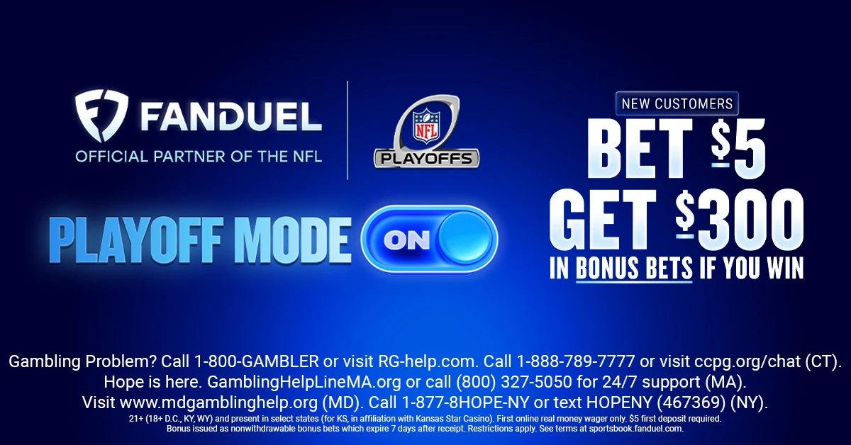 Gambling Problem? Call 1-800-GAMBLER or visit RG-help.com. Call 1-888-789-7777 or visit ccpg.org/chat (CT). Hope is here. GamblingHelpLineMA.org or call (800) 327-5050 for 24/7 support (MA). Visit www.mdgamblinghelp.org (MD). Call 1-877-8HOPE-NY or text HOPENY (467369) (NY). Must be 21+ (18+ D.C., KY, WY) and physically present in select states (for KS, in affiliation with Kansas Star Casino). First online real money wager only. $5+ first deposit required. Bonus issued as nonwithdrawable bonus bets which expire 7 days after receipt. Restrictions apply. See terms at sportsbook.fanduel.com.
